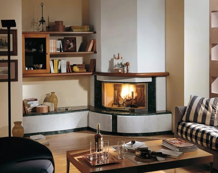 Според местоположението ъглови камини са най -популярни. Основното предимство на такава камина е, че е доста компактна, тъй като обикновено заема неизползвана площ. Това често е решаващ фактор по отношение на икономията на място. Видимостта от всяка точка и възможността да се скрият сградни недостатъци в стаята ще бъдат допълнителни аргументи в полза на инсталирането на ъглова камина.
