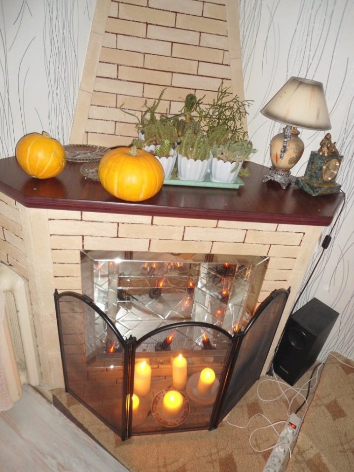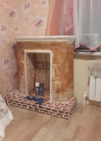 Някои хора решават да направят камина от обикновена кутия от домакински уреди и да залепят структурата с тапет, докато други предпочитат да използват пяна на основата на картон и да украсят своето творение с рафтове, свещи на батерии.