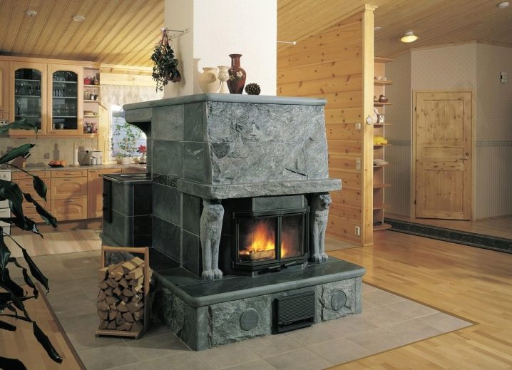 Печките, разположени в центъра на дървената къща, перфектно затоплят цялата стая. Според стандартите пред камината се полага метален лист, който не е в състояние да гори дори при продължително излагане на огън. Разстоянието от вратите на фурната до всяка от стените и тавана трябва да надвишава 125-130 см, а страничните стени на камината се отстраняват от стената на разстояние най-малко 50 см.
