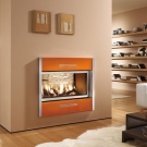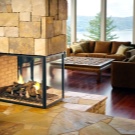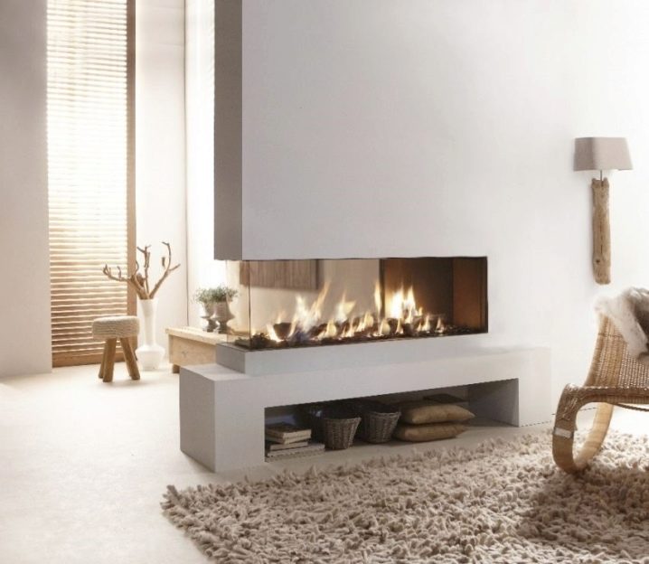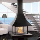 - Тристранно. Неслучайно е получил това име. Този дизайн е общ изглед на огнището. Тристранна камина перфектно ще затопли повече от една стая в къща или апартамент. Разглежданият модел на камината има свои собствени дизайнерски характеристики. Необходимо е наличието на три чаши. Опцията изглежда стилно, когато всички врати могат да бъдат отворени. За безопасността на членовете на семейството много модели от този тип имат врати със заключване. В този дизайн страничните стени са изработени от огнеупорно стъкло. Това осигурява допълнителна безопасност по време на работа на камината..