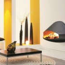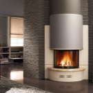 - Полукръгла. Можете да намерите както стационарни, така и обемисти проби, както и малки стъклени опции за малки помещения. По правило такива модели могат условно да бъдат разделени на три типа: островни, вградени и монтирани на стена. Полукръгли камини с дърва могат да отопляват няколко помещения. Моделите на електрически камини с полукръгло стъкло също са популярни..