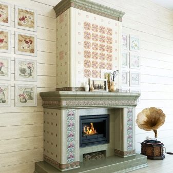 В руските модели по -често се използват суздалските и холандските версии на боядисване на плочки. Те се използват в различни конфигурации в декорацията на камината. Този модел има много предимства. Той запазва топлината в помещението по -дълго от мрамора. Спестява гориво при нагряване и може да запази привлекателния си вид в продължение на много години.