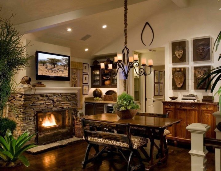 Всеки дизайн на стаята ще блести със специални цветове, ако в нея има камина. Има огромно разнообразие от видове камини и стилистични техники за поставянето им в къщата. Най -впечатляващият, може би, по всяко време е интериорът на ловната хижа. Изобилието от дърво, резбовани мебели и животински кожи е впечатляващо.