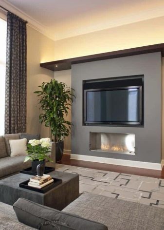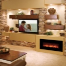 - Етична страна – да не спестите място? Неумелата комбинация от огън и плазма прави интериора евтин, сякаш се опитвате да облечете всичко най -хубаво наведнъж. Те се съветват да зададат различни зони, да балансират или веднага да подчертаят едно нещо. Камина и телевизор с различни размери и стилове определено няма да могат да създадат приятели.