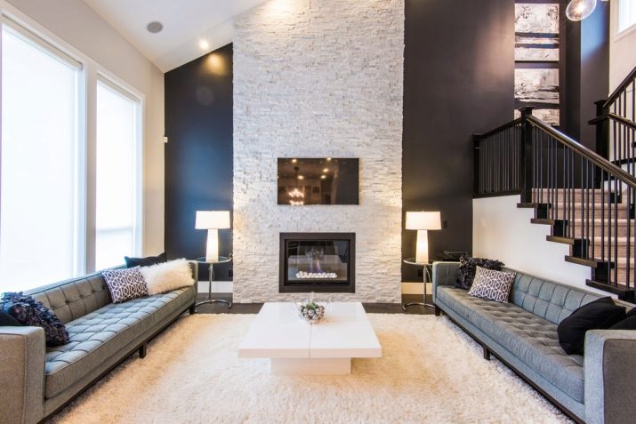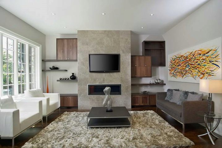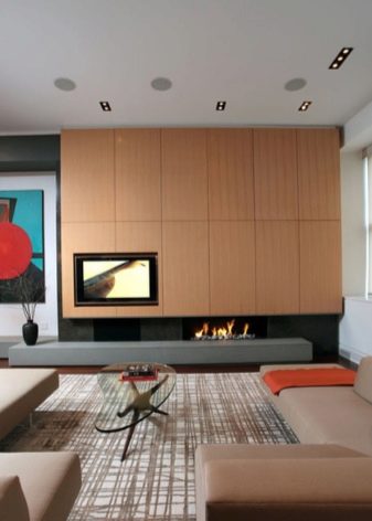 Поставянето на една стена в рамките на съвременните стилове се осъществява. Меката група се поставя в кръг. А екранът и камината са ориентирани на една и съща хоризонтална линия, леко повдигайки прозореца на огнището над пода. Препоръчително е да използвате ултрамодерна портална рамка, така че визуално да прилича на вашия телевизор. Тази позиция на камината и телевизора е възможно най -симетрична и ако е възможно, те предлагат да смекчат опозицията, като окачат платно за изкуство на същата стена между портала и екрана на по -висока линия.