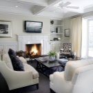 Камината е сърцето на къщата. Телевизорите са се превърнали в негова модерна подмяна, затова често се поставят в общи стаи, където може да се събере цялото семейство. Ако в една голяма стая има както портал за камина, така и плазма, тогава има няколко решения как да инсталирате и двата „прозореца“, за да не претоварвате пространството. Основното правило е, че телевизорът е поставен върху камината или в една линия, в противен случай магията на огъня губи своя чар.