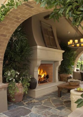 Външната камина е най -добре да се монтира в беседка или на веранда, тоест под навес. Това ще помогне да се предпази камината от заплахата от разрушаване поради метеорологичните условия. Поради тази причина външната камина трябва да бъде направена от устойчив на износване материал като тухла или камък. Можете да направите стоманена камина с барбекю, така че да служи повече от декоративна функция.