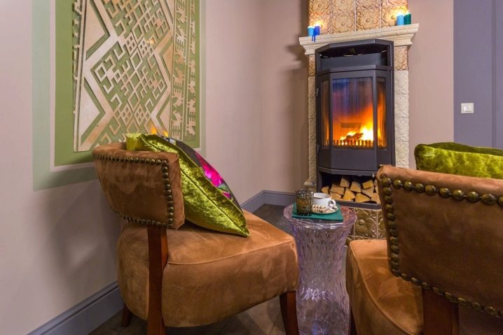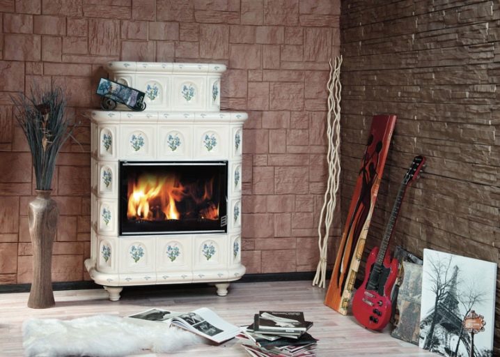 Особеността е ъгловата конструкция с керамична облицовка. Такава печка ще се превърне в достойна украса на всеки интериор..