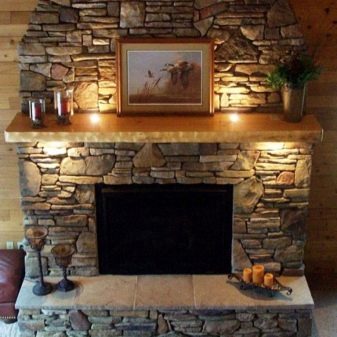 Най -евтиният, но не по -малко интересен е речният камък. Облицовката с такъв материал е по -подходяща за вили, вили и селски къщи. Речният камък като декоративен дизайн за камина в градски апартамент е много екстравагантно и оригинално решение.