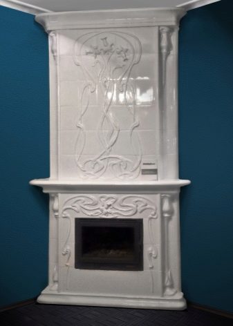 В къщи с малка площ или апартаменти камините обикновено се монтират в ъгъла. Идеално място за спестяване на място, но с тази настройка се вижда само предната част на камината. Това означава, че само секцията на портала над камината може да бъде покрита с плочки с шарки, а останалите елементи могат да бъдат облицовани с обикновени модели плочки..