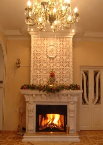 - Лаконизмът на класическия стил се подчертава най -добре от камини, декорирани с немски плочки, както и плочки без шарка..