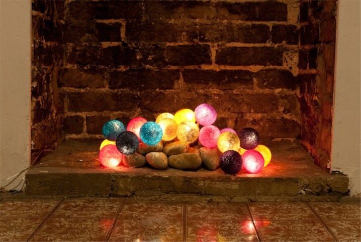 Увиваме клоните с фолио без пропуски, залепваме дантела върху фолиото. Оставете да изсъхне за около един ден. След това изрязваме и внимателно изваждаме клоните на дърветата. Оформяме кръг от камъни (ако желаете, камъните могат да бъдат боядисани във всякакъв цвят), разстиламе гирлянда в средата и оформяме получените дантелени клони като огън. Включете гирляндата и трупите ще блестят с искри в огнени цветове. Това е невероятно прост и ефективен начин да създадете фалшив огън в камина..