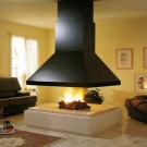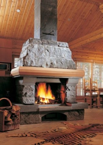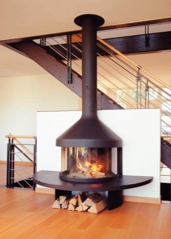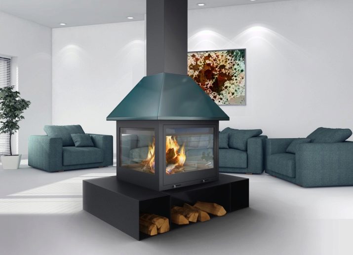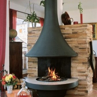 Разположението на ъглите или от стена до стена е подходящо за не твърде големи помещения. Но ако стаята е с впечатляващи размери, тогава инсталирането на камина в центъра е отлично решение. Това се дължи на факта, че не е необходимо да затопляте уличната стена, като по този начин топлината не се губи и такава камина работи много по -ефективно..