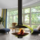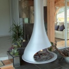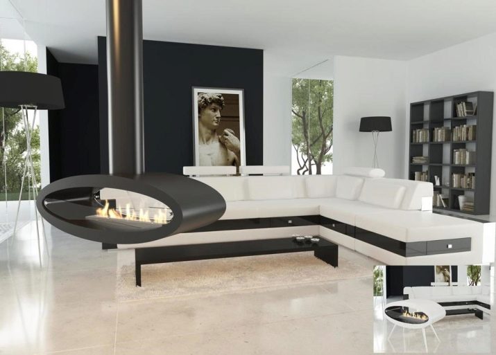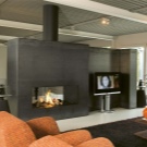 За любителите на оригинални решения в интериора, висящата камина е идеална.. Този необичаен дизайн, въпреки цялата си нестандартност, е запазил функциите на огнището. Основната част – тяло от лек метал – се монтира към тавана или по -рядко към стената с помощта на тръба. Има както висящи камини на твърдо гориво, така и био камини. Недостатъците на такова устройство включват нисък топлопренос, висока цена и сложност на инсталацията..