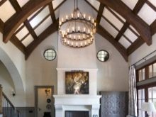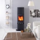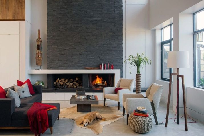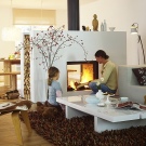 В стая с високи тавани е възможно да се монтира тристепенна камина. Всеки слой носи свое функционално натоварване: долният служи като удобна опора за горивната камера, самата камина е разположена на второто ниво, а в горната част са поставени допълнителни топлинно акумулиращи керамични пръстени. Този дизайн ви позволява да поддържате топлина до 18 часа след гасенето на пламъка..