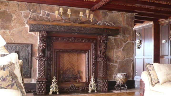 Дървената облицовка не е достатъчно лоша. Материалът е направен от абсолютно всякаква форма и размер, той е екологичен и лек. Вярно е, че трябва да се използва само за декоративни електрически камини. Специална екстравагантност и уникалност на външния вид на камината може да се придаде с помощта на дърворезба.