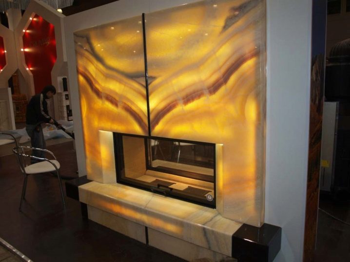 Много ефективен естествен камък. Той има полупрозрачна структура, поради което се получават изящни дизайнерски камини. Често ониксът е инсталиран с вътрешно осветление, а понякога и в композиция с мрамор или гранит. Външно материалите са много сходни. Въпреки това, в допълнение към прозрачността, ониксът има най -високите технически характеристики за разлика от други естествени камъни..