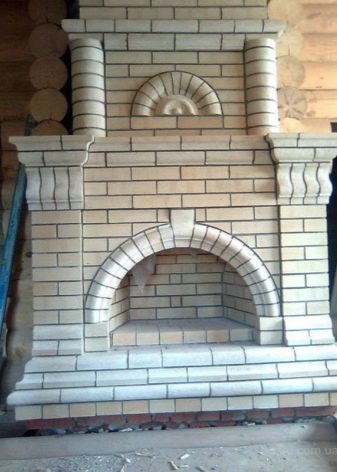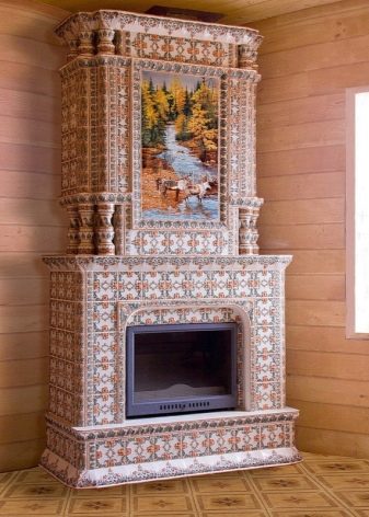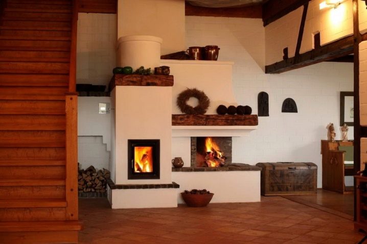 Това са камини в селски стил. Този дизайн ще изглежда добре в къща на дърво. Тавани от естествено дърво, хармонично съчетани облицовки на стени и тъмни подове. Освен това използването на тапети в този случай е напълно непрактично. Те бързо ще станат неизползваеми поради фурната. Руската печка ще работи добре. Издълбаните декоративни елементи добавят оригиналност и изключителност.