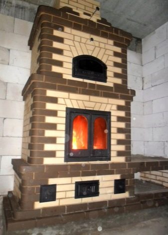 Има фурни, които изобщо нямат котлони. Те представляват елементарна структура от стени с канали за отстраняване на дим, разположени между тях, горивни камери, почистващи и продухащи камери. Такива агрегати се използват за отопление. Друг вариант е камина печка с отоплителна и готварска повърхност. Такива фурни привличат със своята универсалност. Те са по -трудни за проектиране и инсталиране. Помислете за няколко интересни разновидности тухлени камини: