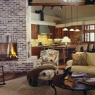 Интересно решение би било да инсталирате островна камина директно в стената. В средата на стаята е монтирана не широка тухлена стена, а в средата е направен отвор за камина. Пламъкът ще се вижда от четирите страни, но си струва да се погрижите за здравината на конструкцията: монтирайте метални щифтове в ъглите на стената и ги облицовайте с квадратни тухли. Горната част на стената ще служи като място за комина. Такова решение ще бъде интересно в отворени и затворени версии..