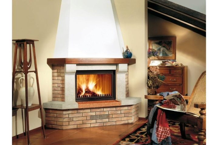 Ъгловият модел е подходящ за относително малки помещения и не заема много място. Такава мини камина за лятна вила е доста проста за производство, има добро сцепление и стабилна структура. Ъгловите модели бързо загряват и затоплят помещението.