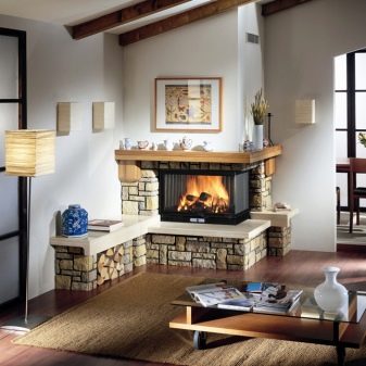 - Вариант В – ъглова камина. Специален случай, разположен не на една, а на две стени наведнъж. В тази връзка е по -икономично да се строи, но по същата причина има по -малка площ за отопление..