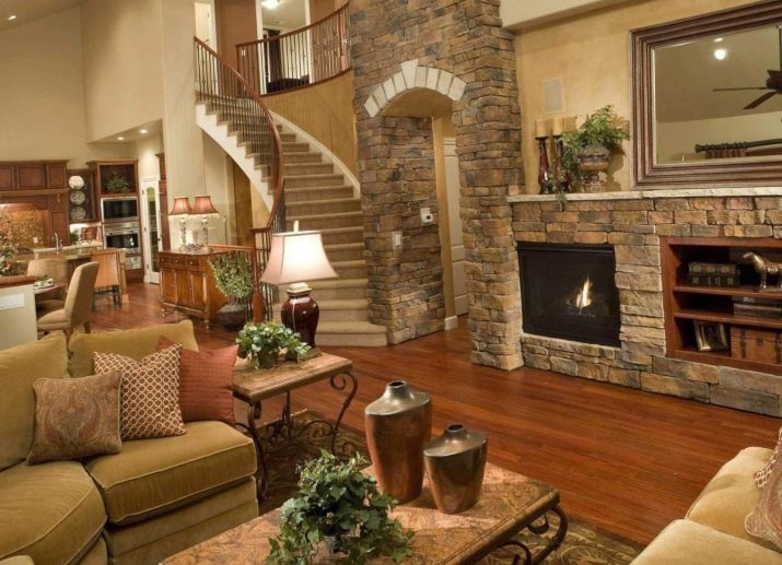 Допълването на хола с камина трябва да бъде органично. За да постигнете хармония във всеки детайл, можете да се обърнете към модерните днес стилове, допълвайки познатия интериор с тематични аксесоари, нови тапицерии за мебели или цветни решения, характерни за стила..