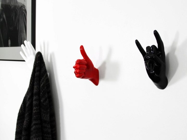Необичайният дизайн на куки за дрехи под формата на човешка ръка ще украси всеки коридор. В асортимента на съвременните магазини ще намерите модели, изобразяващи различни жестове. Например „добре“, „отлично“, „козе“ и други.