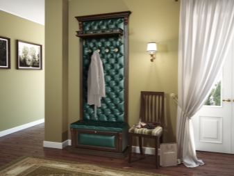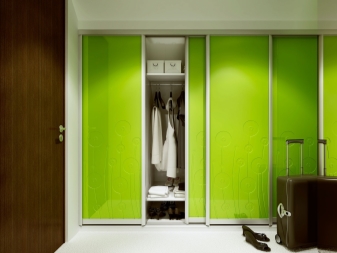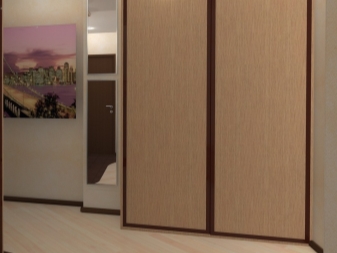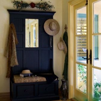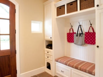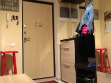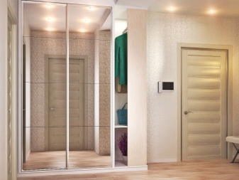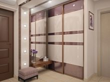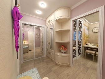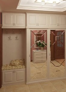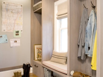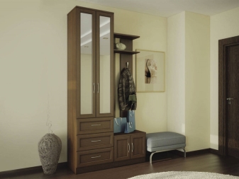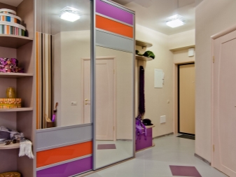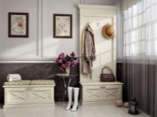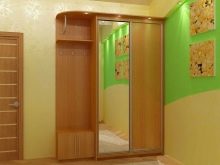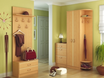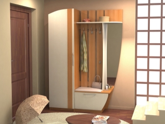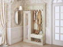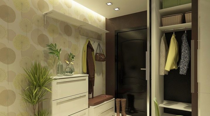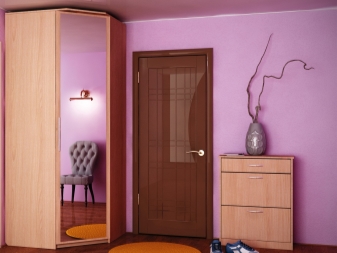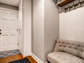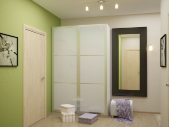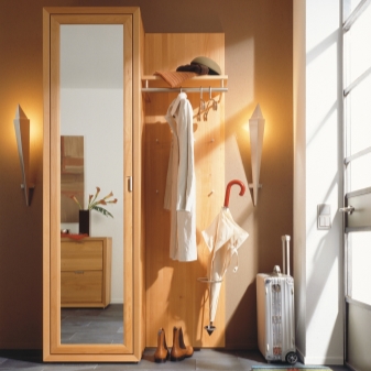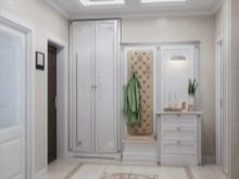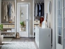 Гардеробът трябва да е доста висок. Това е необходимо, за да заема по -малко място и да се възползва максимално от височината на помещението. Тя трябва да съдържа всички необходими елементи, като рафтове за обувки, чекмеджета, рафтове за аксесоари, закачалки за връхни дрехи и някои аксесоари. След като сте инсталирали такъв шкаф, можете да намерите свободно място за инсталиране на фотьойл, тахта, мини скрин или други мебели. Когато подреждате тази стая, обърнете внимание на ъгловите мебели, тъй като тя също заема много малко място..