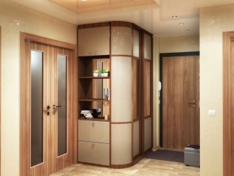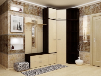 Някои характеристики трябва да се вземат предвид при подреждането на ъглови мини-коридори. Такива малки стаи са най -трудни за правилно обзавеждане. Но голямото предимство на такава стая е, че не е нужно да си натрапвате мозъка за това как да подредите мебели по коридора. В този случай основното функционално съдържание на тази стая се намира в ъгъла. По правило там се поставя голям просторен гардероб. По -добре е да откажете други системи за съхранение в такъв коридор..