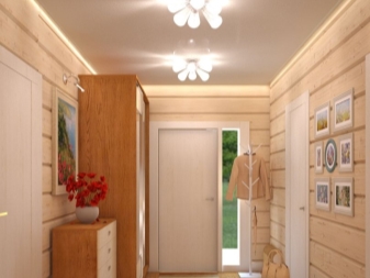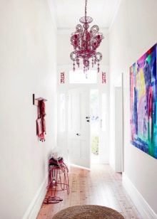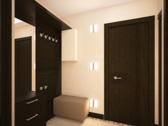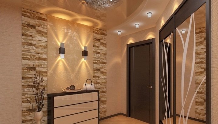 Някои осветителни тела са разположени върху гардеробите. По -добре е да запълните тази стая с много светлинни лъчи, като използвате както лампи, така и лампи или бра. Ако в коридора има гардероб, тогава също е по -добре да инсталирате подсветка вътре в него. Допълнителното осветление никога няма да бъде излишно във вътрешността на такава стая..
