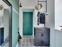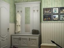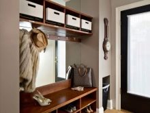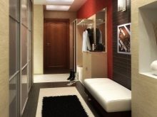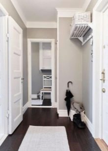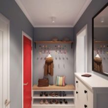 - По -добре е в коридора поставете килима. Можете да обзаведете стаята с леки, спретнати мебели, като скрин, мека тахта, леки рафтове. Можете да инсталирате стелажи за обувки на пода и да прикрепите малки стелажи за ключове и други аксесоари към стените.