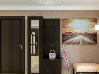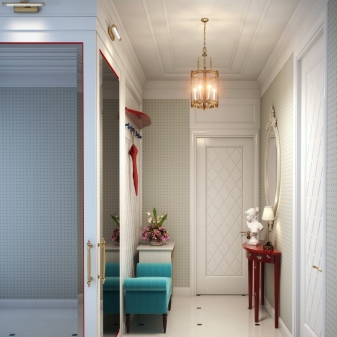 - При декориране на коридор в класически стил необходимо е да се вземе предвид правилото за спазване на строги и правилни форми и липсата на ненужни декоративни елементи. Всички линии трябва да са ясни и строги. В този случай покритията със светли цветове и мебелите с бронзово и позлатено покритие са перфектни. Можете да окачите голямо огледало с красива бронзова украса. Класиката ви позволява да направите такъв коридор по -строг и в същото време елегантен, така че също така е в състояние да запълни тази стая с пространство..
