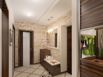 Керамиката и камъкът не са податливи на влага и температурни промени, те са много издръжливи. Тези покрития също са лесни за поддръжка. Това ще ви позволи да създадете перфектния ансамбъл заедно с лъскав фалшив таван и да направите коридора визуално по -просторен..