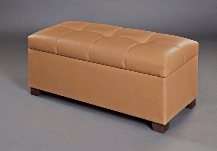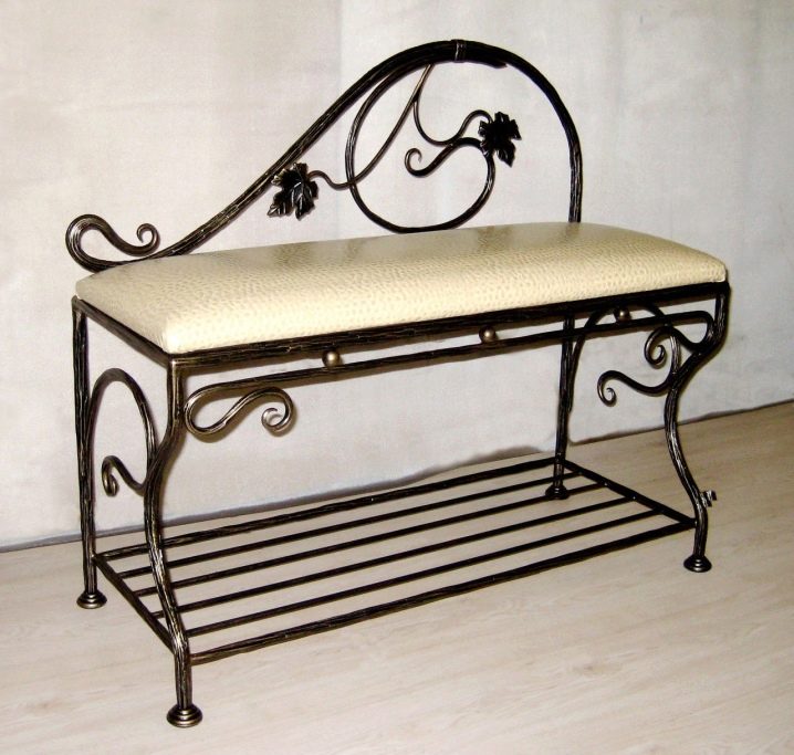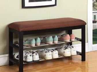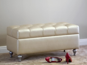 Има класическа заоблена версия на пуфа, чиято седалка е тапицирана с плат. Той ще се впише идеално във всяка среда. Има подобни продукти с квадратна или правоъгълна седалка. Леките, “безтегловни” мебели се създават с помощта на коване. В долната част има специални отделения за съхранение на обувки. По този начин можете да организирате вещите си и да спестите място..