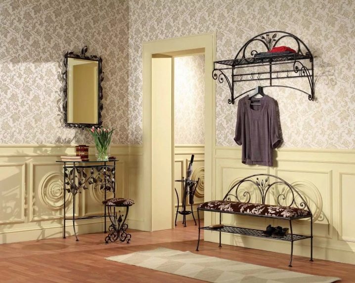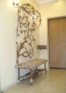 Можете да вземете оригинални ковани продукти. Визуално те ще направят стаята по -просторна. При избора на такива продукти си струва да се обърне внимание на функционалността на мебелите. Шкаф с кутия за обувки ще ви помогне да спестите място и да поставите вещите си.