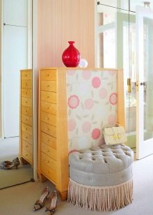 - Тумба-османска. Тази опция е композиция от правоъгълен пуф с скрин или чекмеджета. Дори най -тесните опции ще бъдат доста просторни. Там можете да съхранявате не само обувки, но и други предмети. Можете да поставите неща, портмоне или телефон на нощното шкафче..