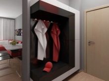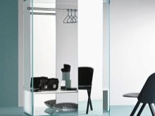 Ако е твърде трудно за възприемане, тогава закачалката с механизъм на усукване изглежда по -обикновена. Тя е разделена на три секции: с куки за дрехи, с огледало и мини шкаф, като такива мебели заемат само 70 сантиметра в радиус.