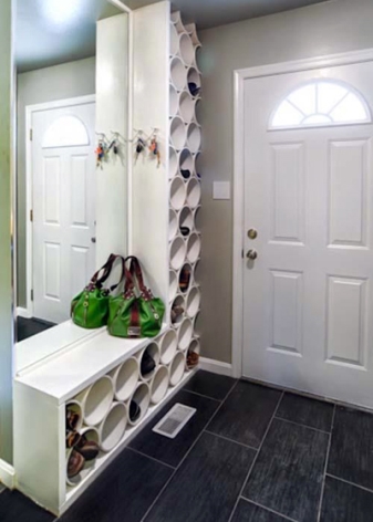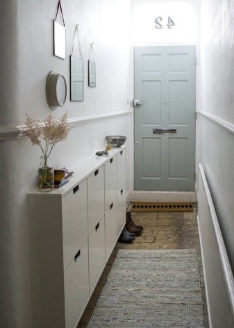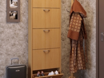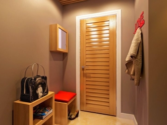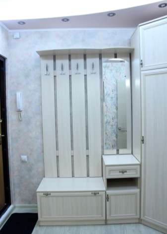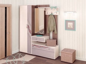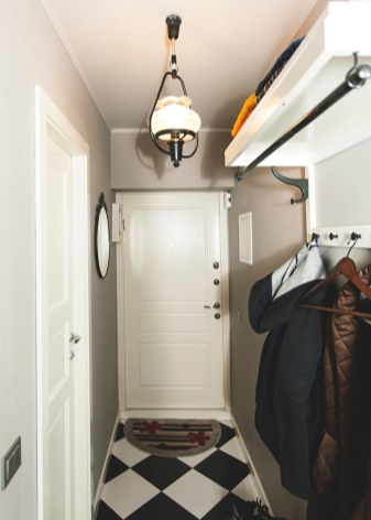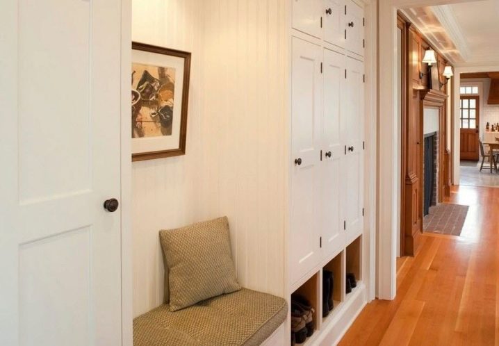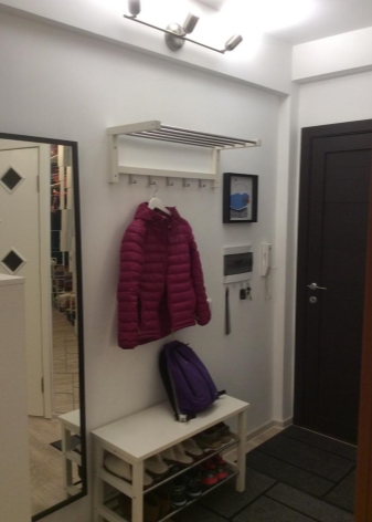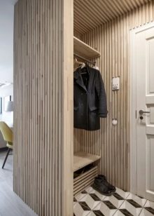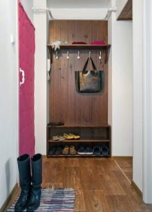 В тази стая може да се монтира и малък шкаф. Можете да поставите обувки, аксесоари, чадъри и други неща в него, а също така да го използвате като седалка. Можете да инсталирате закачалки за стена, на които можете да закачите дрехи, без да използвате големи мебели. Обичайно е да закачате рафт за шапки и шалове над закачалките. Тази отворена система за съхранение се допълва от долни рафтове за подреждане на обувки на няколко нива..