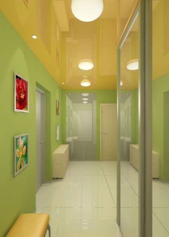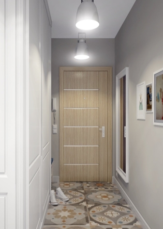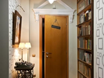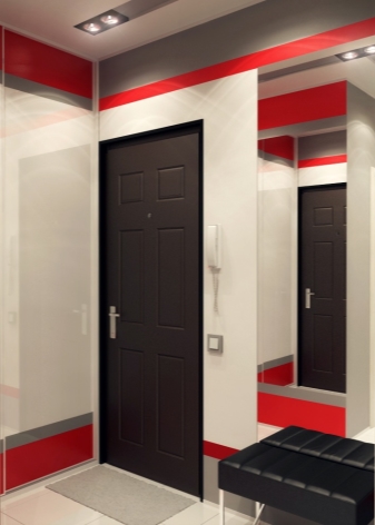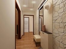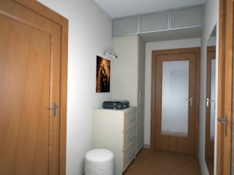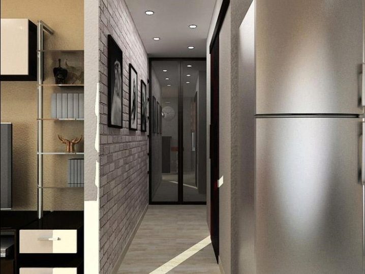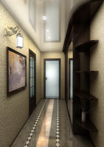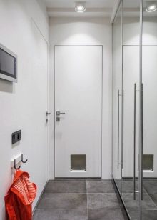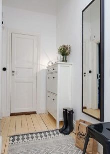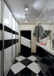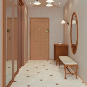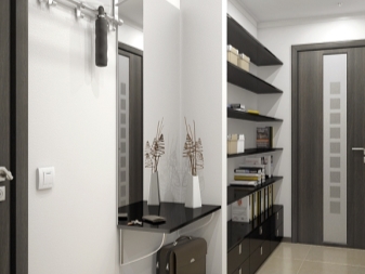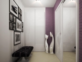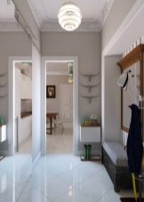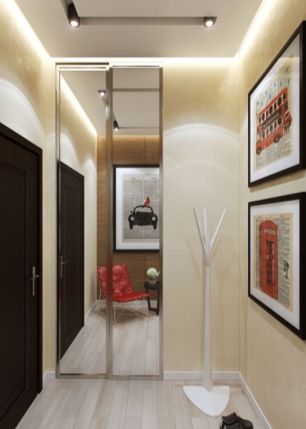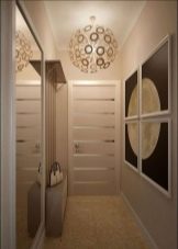 В такъв коридор можете да инсталирате шарнирен огледален шкаф. По -добре е, ако съдържа отделения с рафтове за съхранение на някои аксесоари, козметика и други необходими неща. Този дизайн на коридора е доста популярен..