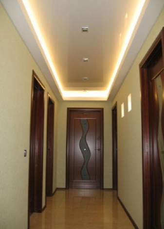 Повечето осветителни тела трябва да бъдат разположени по протежение на по -дългата стена на коридора. По -добре е да насочите осветлението към противоположните стени и нагоре. Така че можете да играете със светлината и да поставяте светли акценти. Опитайте се да премахнете тъмните ъгли и да създадете осветление с мека, разсеяна светлина..