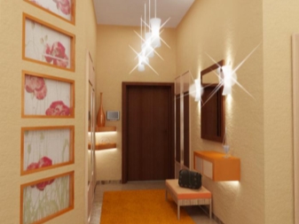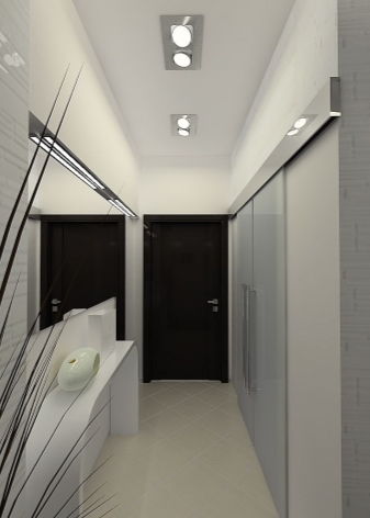 На дълга стена в тесен хрушчов коридор е по -добре да не инсталирате лампи в средата, тъй като по този начин можете да я направите по -къса. Това решение е подходящо само ако искате да приближите формата на коридора до квадрата..
