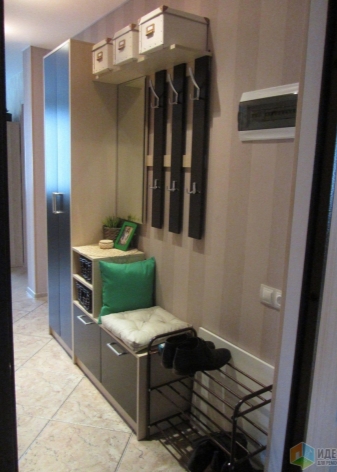При декориране на по-просторно антре на двустаен апартамент могат да се организират съвременни системи за съхранение. Така че, можете да инсталирате шкаф за обувки за съхранение на обувки с красиви високи страни и няколко нива и високи скринове, както и малък пуф, който ги разделя. Основното е, че такива мебели са тесни и компактни..