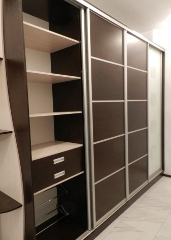 Плъзгащият се гардероб може да се монтира в ъгъл или да се постави по протежение на стената. Обикновено е много висока, така че височината на помещението ще се използва възможно най -много. Такава система за съхранение ще превърне обикновен гардероб в гардероб, където ще поставите връхни дрехи, аксесоари и по -леки неща..