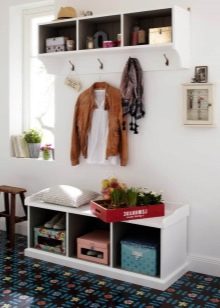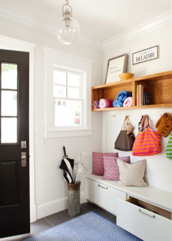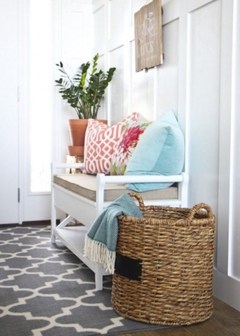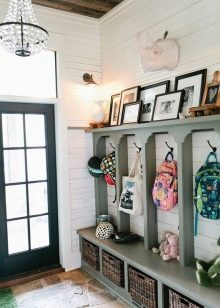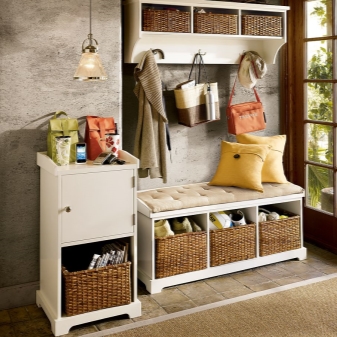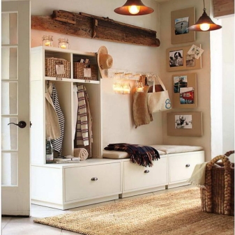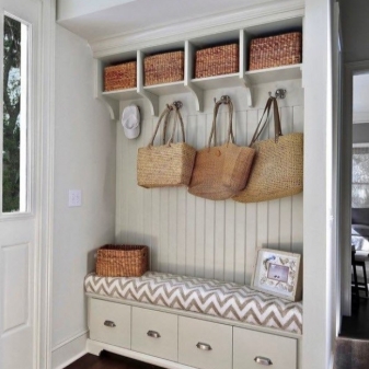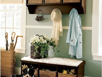 Плетени кошници за пране и съхранение на битови предмети могат да се поставят до входната врата. По -добре е да скриете всички проводници, комуникационни системи от любопитни очи. Те изглеждат подходящи в стила на таванско помещение, градски шик, фюжън, но за провинциални и селски мотиви те са „лоши маниери“.