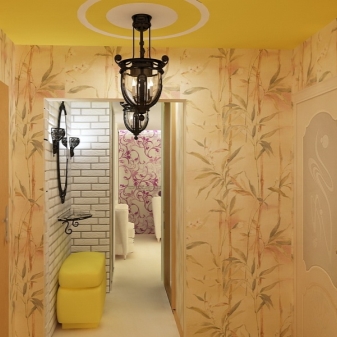 Ако вашият избор падна върху тапети, опитайте се да потърсите евтини модели без ефекта на велур, кадифе, гланц. На тях не трябва да се показват пайети, абстракции и поп арт отпечатъци. Флорални мотиви, ненатрапчиви малки флорални шарки, контрастни ивици или полка – това са основните идеи за създаване на “фон” в коридора.