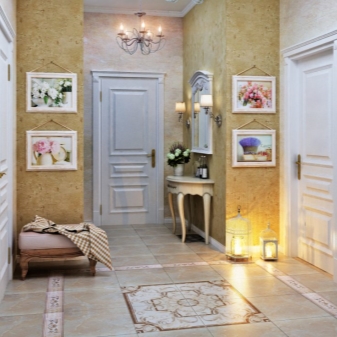Стена, украсена с мазилка с груба текстура, ще изглежда изящна. Ако решите да поставите дървени дъски на пода, тогава е по -добре да украсите стените с големи фрагменти от керамични плочки. Когато оборудвате коридора, не забравяйте да окачите няколко картини, например с лавандулово поле.