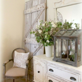 Някои предпочитат да боядисват стените в бяло, като поставят акценти със сини или тюркоазени дъски, бледо люлякови мебели. Други ще искат да поставят маса или диван с метални крака под стена с непретенциозен модел, за да придадат ефекта на стареене на самия гардероб. Огромно огледало по цялата стена няма да бъде излишно. Дизайнерите препоръчват да го декорирате с бяла дървена рамка..