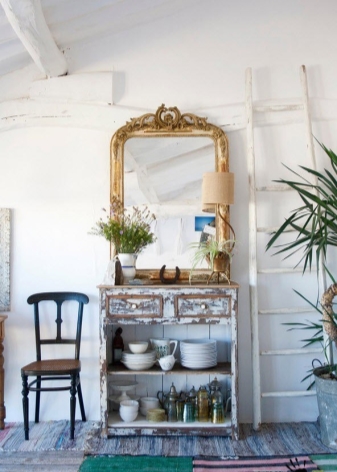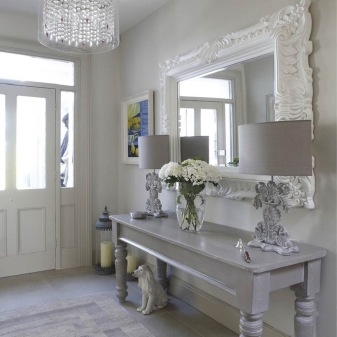 В селска къща можете да поставите дървени палетни кутии и сандъци под обемно огледало в коридора. Те ще направят интериора по -малко наперен и ще ви позволят да се насладите напълно на духа на Прованс. За апартамент е по -добре да се ограничите до настолна лампа, стилен часовник и други аксесоари, които отразяват концепцията за селска страна.