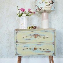 мебели с декоративни пукнатини, ненатрапчиво пръскане на теракота, пясък, заглушено индиго;
